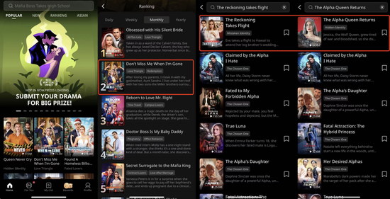 蓝鲸新闻查询发现,其中一部作品《Don‘t miss me when I’m gone》(点众称其侵权《出走后,两个竹马悔疯了》)位列ReelShort站内日/周榜首和月榜第二,并出现在首页推荐中,页面显示其播放量超7000万。此外还有多部声明中提及的作品站内播放量在6000万以上。