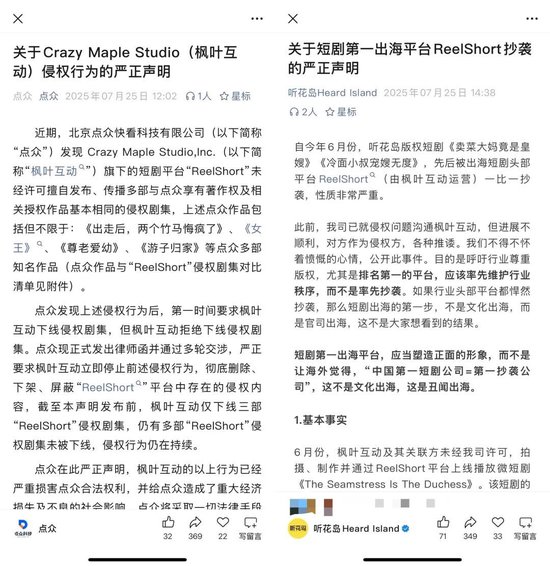 25日,短剧公司点众科技、听花岛发布声明称出海头部平台ReelShort相关作品涉嫌侵权。两家公司在同日先后发布声明称,ReelShort上线播放的多部海外短剧与其国内权利作品“基本相同”、涉嫌“一比一抄袭”。声明中明确提及名字的作品有6部,其中大部分是去年已上架的作品。