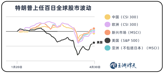 这是美国总统特朗普上任百日的全球股市波动情况。原本保持涨幅的美国股市,却在一次又一次的关税威胁中不断下跌。